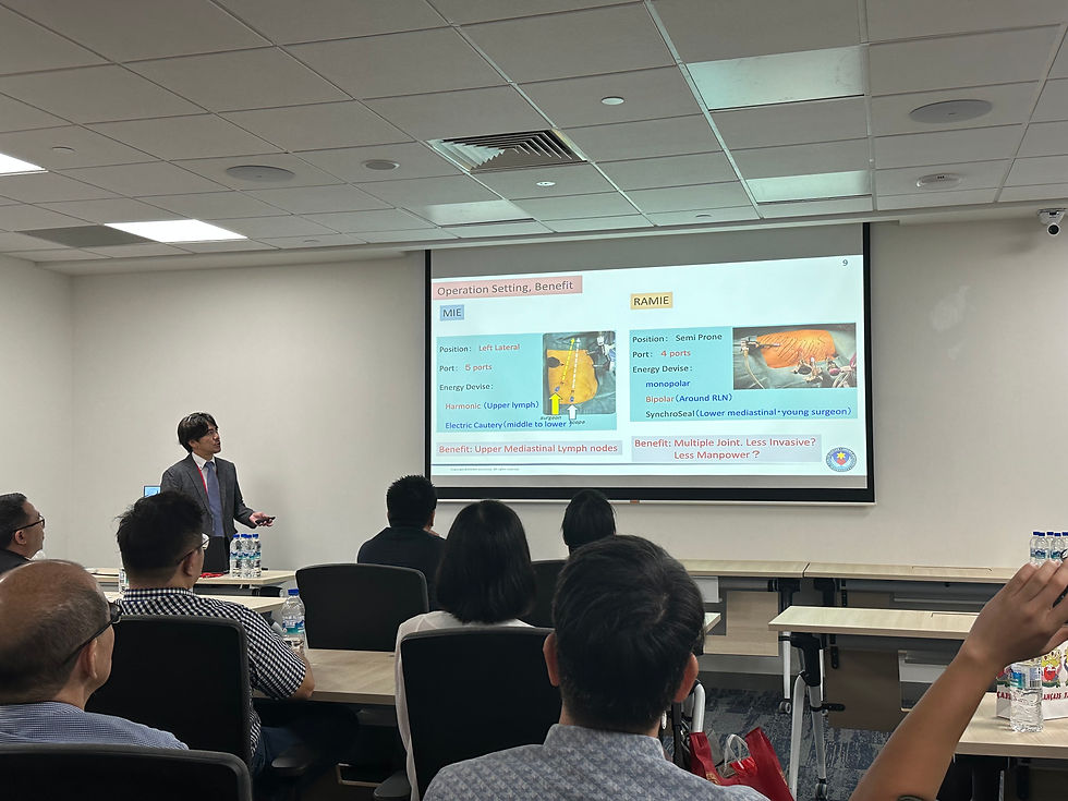シンガポールでは、食道癌、胃癌、減量手術、腹壁ヘルニアなどを上部消化管外科が担当されていますが、これらの領域のロボット支援手術についてシンガポールの各病院の先生だけでなく、タイから演者の先生がお越しになっていました。その中で、大塚教授はロボット支援食道癌手術についてご講演されました。日本の食道癌手術は各国から称賛されており、質問が飛び交いとても有意義なディスカッションが行われました。